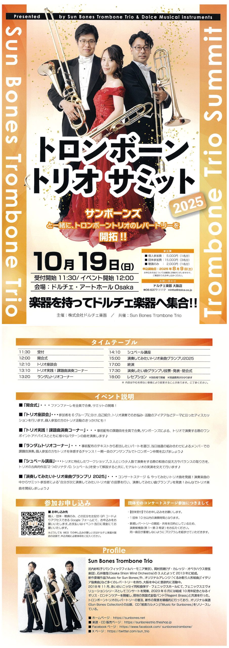 出演者 | Sun Bones Trombone Trio トロンボーン 武内 紗和子(パシフィックフィルハーモニア東京) 岡村 哲朗(ザ・カレッジ・オペラハウス管弦楽団) 石井 徹哉(Osaka Shion Wind Orchestra) |