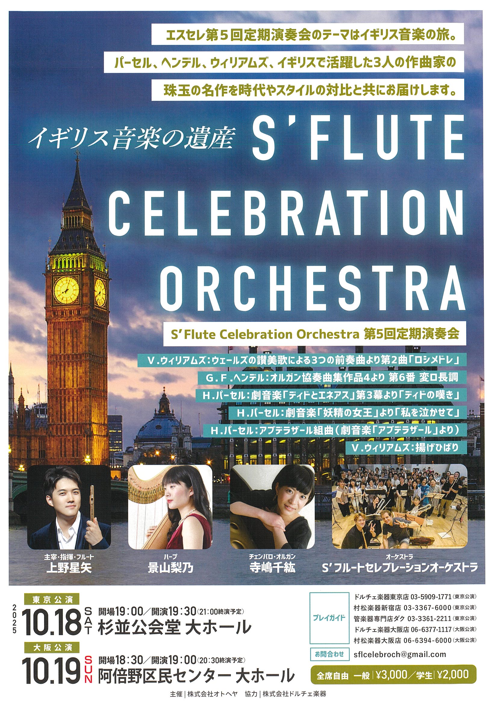 出演者 | 上野 星矢(主宰・指揮・フルート) 景山 梨乃(ハープ) 寺嶋 千紘(チェンバロ・オルガン) S’フルートセレブレーションオーケストラ(オーケストラ) |