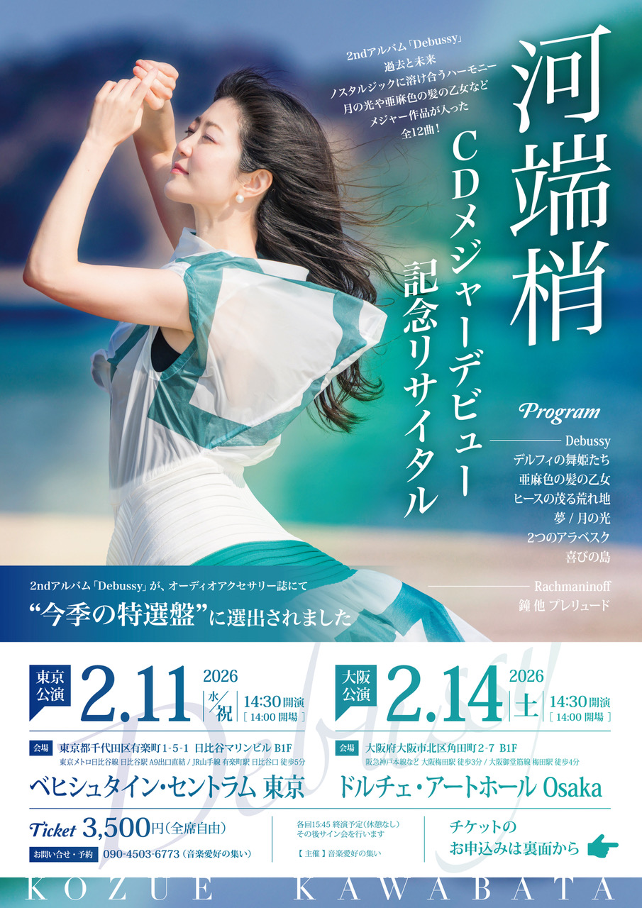 | プログラム | Debussyー デルフィの舞姫たち 亜麻色の髪の乙女 ヒースの茂る荒れ地 夢 / 月の光 2つのアラベスク 喜びの島 Rachmaninoffー 前奏曲「鐘」 ほか |