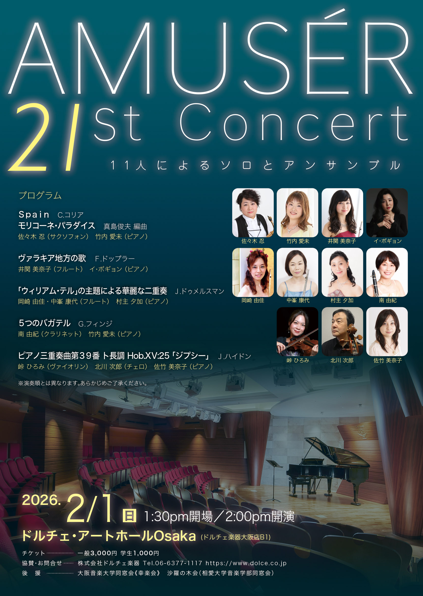 | 出演者 | ヴァイオリン|峠 ひろみ チェロ|北川 次郎 フルート|井関 美奈子、岡崎 由佳、中峯 康代 クラリネット|南 由紀 サクソフォン|佐々木 忍 ピアノ|竹内 愛未、イ ボギョン、村主 夕加、佐竹 美奈子 |