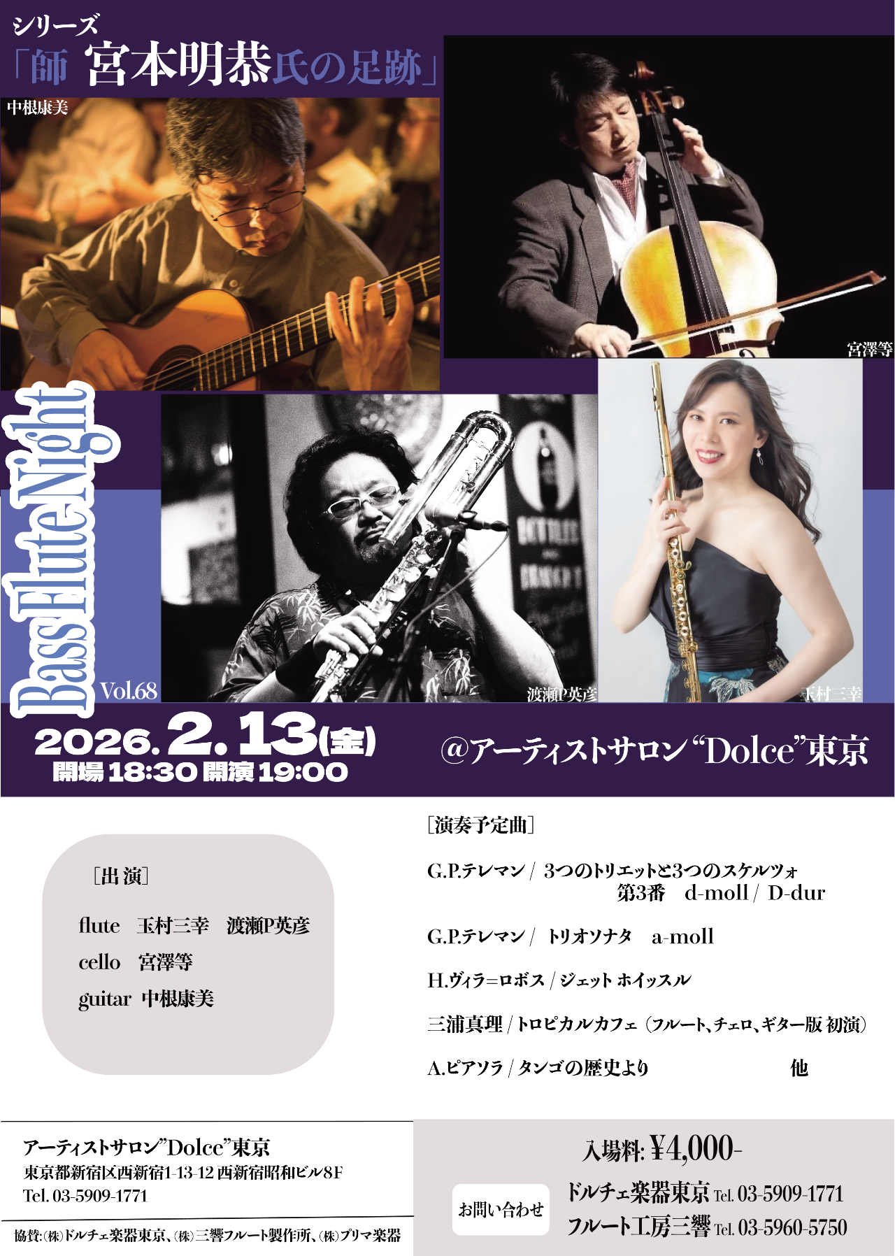 | 出演者 | Flute:玉村三幸、渡瀬P英彦 Cello 宮澤等 Guitar 中根康美 |