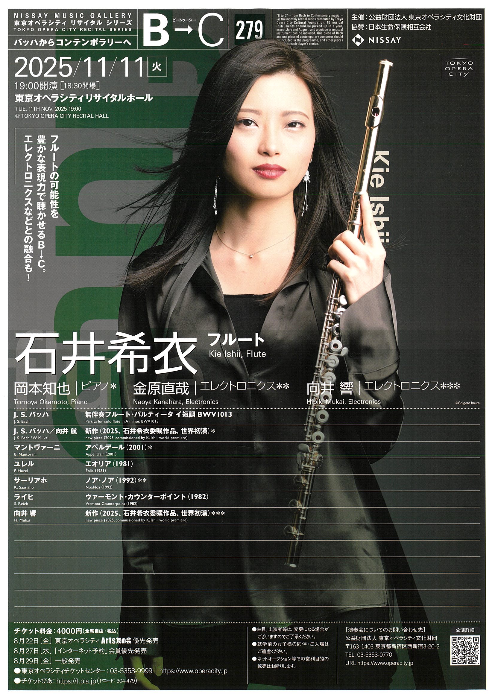 | プログラム | J.S.バッハ:無伴奏フルート・パルティータ イ短調 BWV1013 J.S.バッハ(向井航):新作(2025、石井希衣委嘱作品、世界初演) マントヴァーニ:アペルデール ユレル:エオリア サーリアホ:ノア・ノア ライヒ:ヴァーモント・カウンターポイント 向井響:新作(2025、石井希衣委嘱作品、世界初演) |