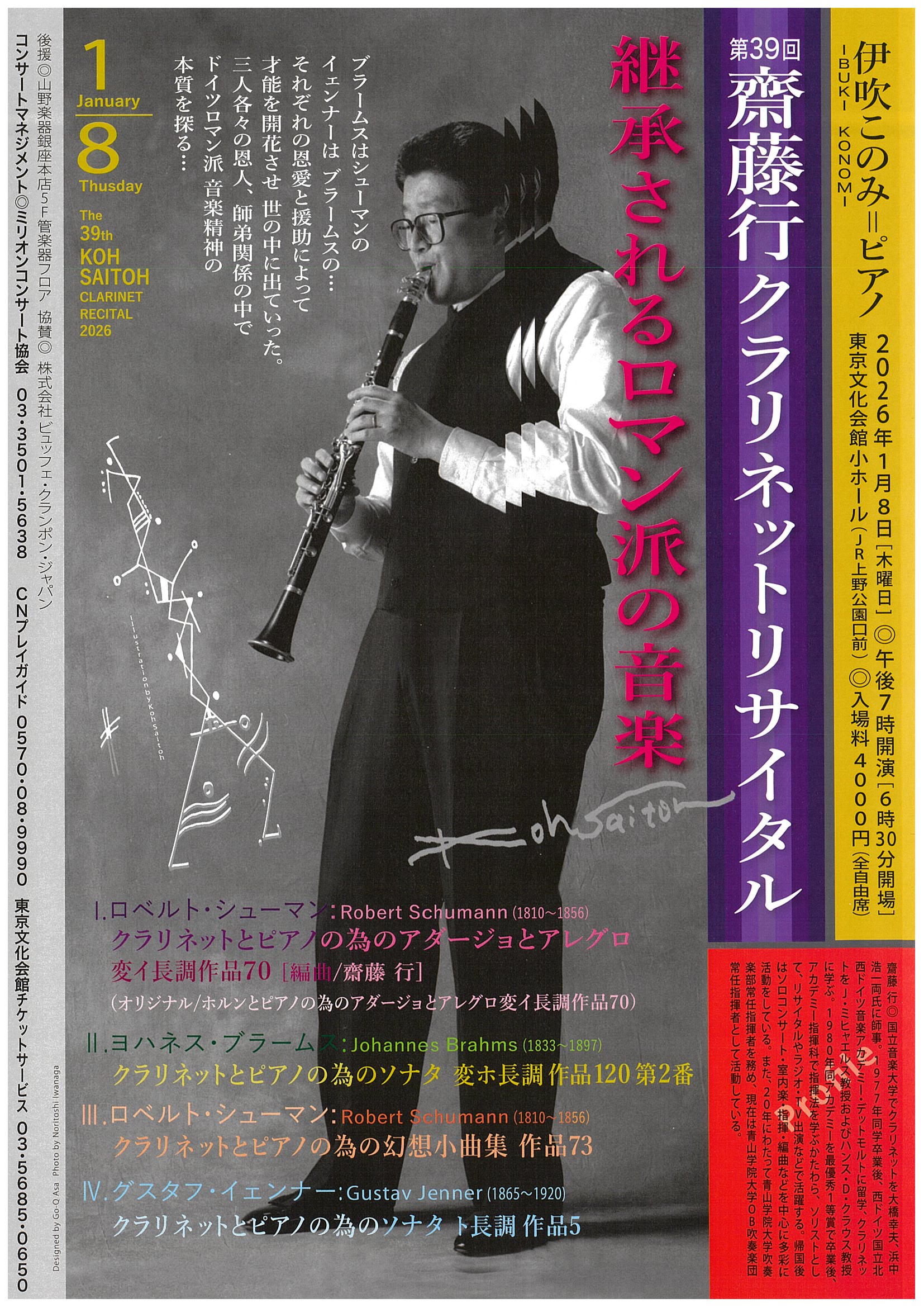 | プログラム | ロベルト・シューマン(編曲:斎藤行):クラリネットとピアノの為のアダージョとアレグロ変イ長調作品70(オリジナル/ホルンとピアノの為のアダージョとアレグロ変イ長調作品70) ヨハネス・ブラームス:クラリネットとピアノの為のソナタ変ホ長調作品120第2番 ロベルト・シューマン:クラリネットとピアノの為の幻想小曲集作品73 グスタフ・イェンナー:クラリネットとピアノの為のソナタト長調作品5 |
