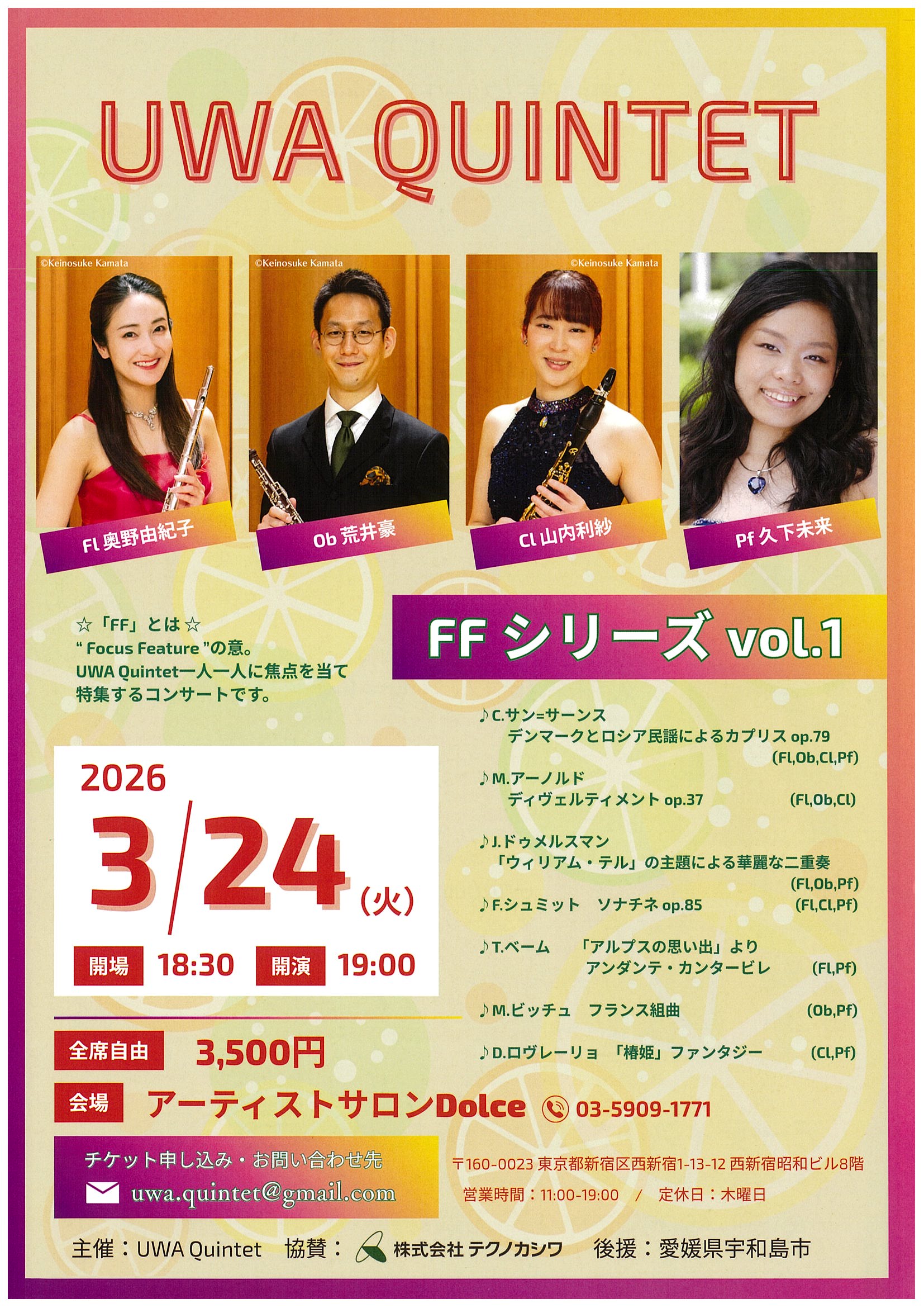 | 出演者 | 菅野 まち(フルート) 澤廣 百合子(オーボエ) 田村 優果(クラリネット) 阿部 和輝(ファゴット) ※賛助:山崎 健希(ホルン) ※賛助:三友 優(ピアノ) |