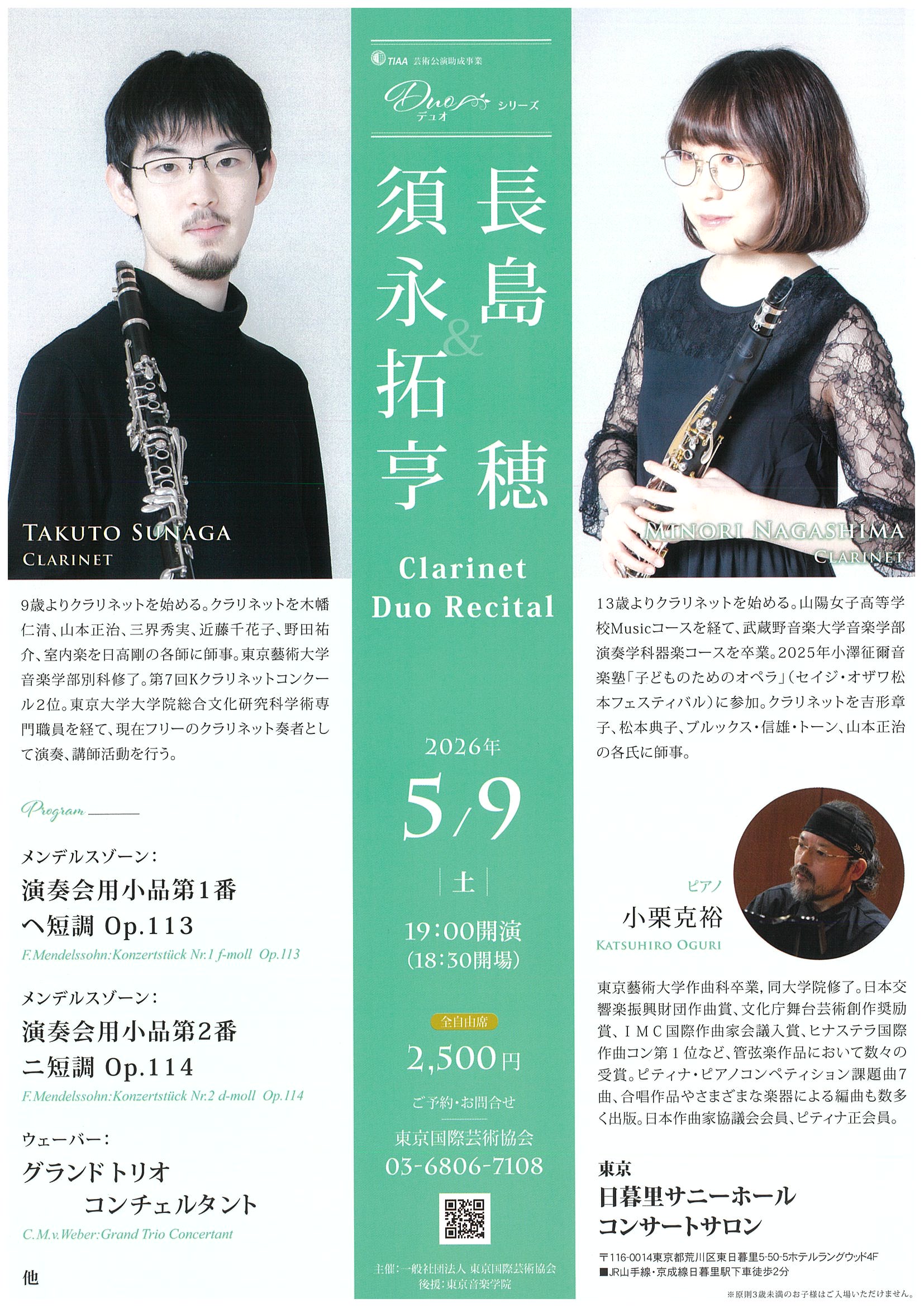 | 出演者 | 須永 拓亨(クラリネット) 長島 穂(クラリネット) 小栗 克裕(ピアノ) |