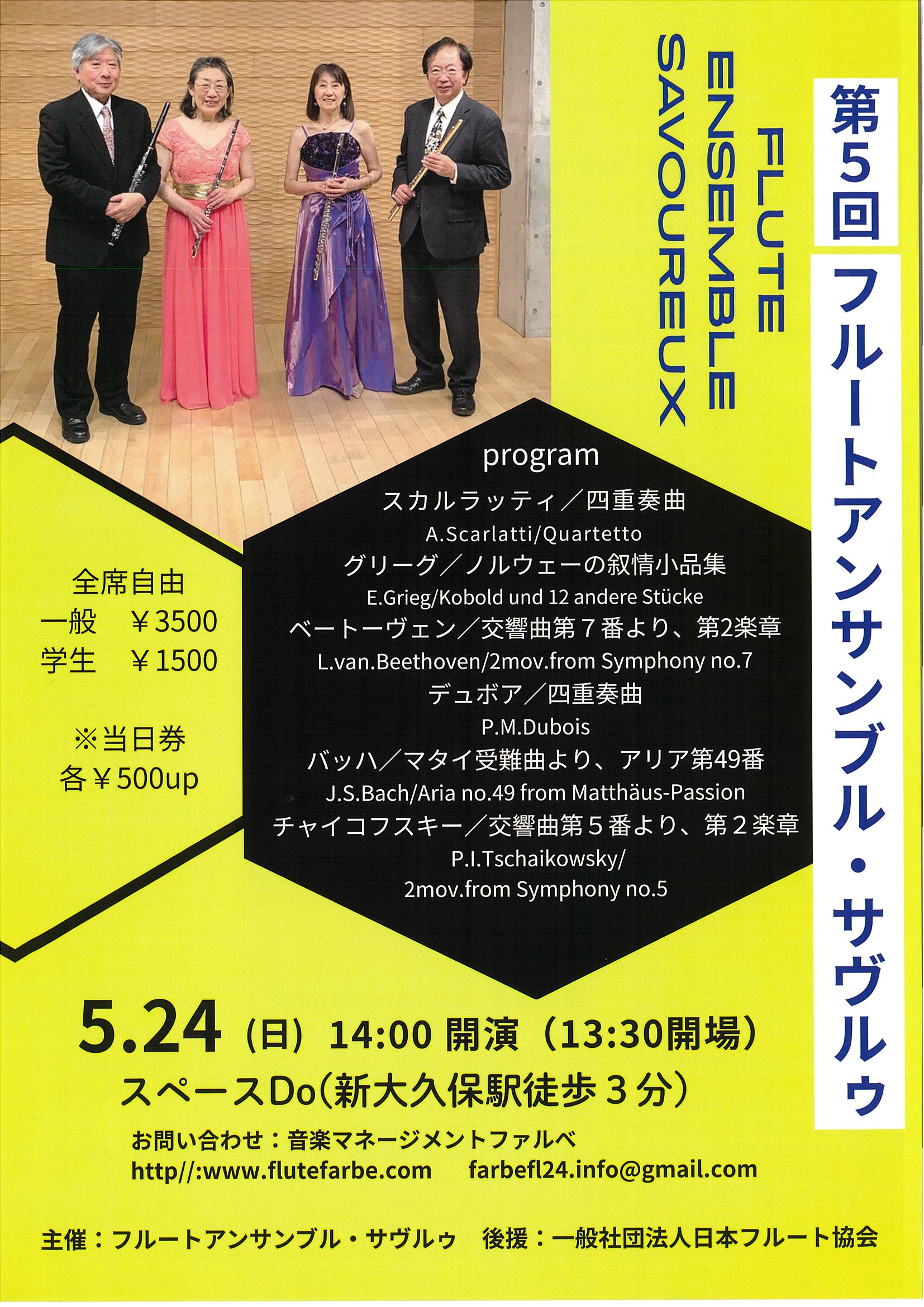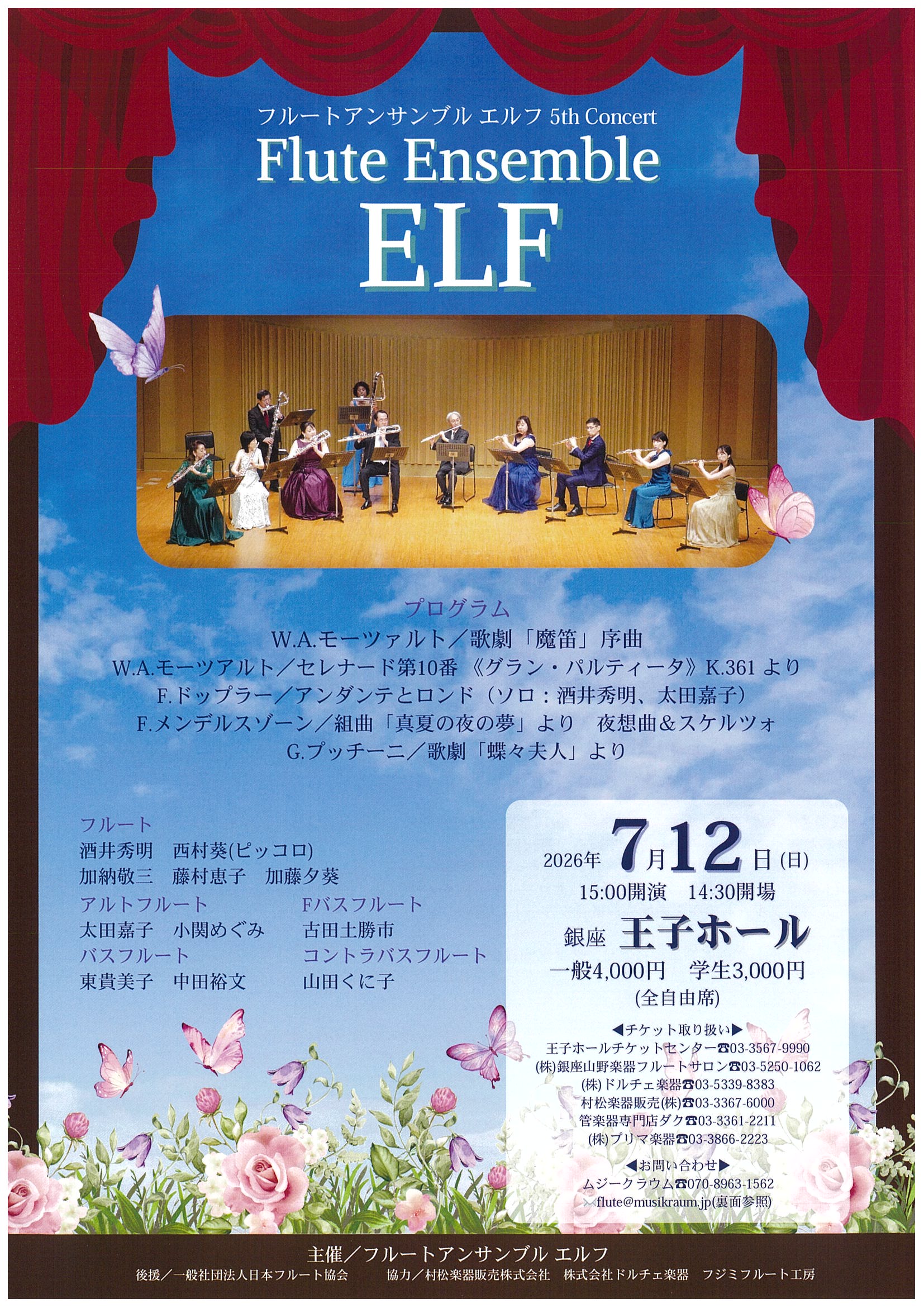 | 出演者 | 酒井 秀明(フルート) 西村 葵(ピッコロ) 加納 敬三(フルート) 藤村 恵子(フルート) 加藤 夕葵(フルート) 太田 嘉子(アルトフルート) 小関 めぐみ(アルトフルート) 東貴 美子(バスフルート) 中田 裕文(バスフルート) 古田土 勝市(Fバスフルート) 山田 くに子(コントラバスフルート) |