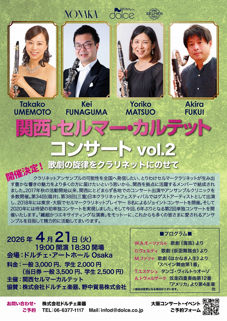[事前に決済できる!電子チケット「LivePocket」での購入はこちら] *LivePocketは、電子チケットです。インターネット上でコンサートチケットを事前にご購入いただくと、 発行されるQRチケット(スマートフォン等で表示)にてご入場可能です。 *ご購入には”LivePocket”のアカウントご登録が必要です。 ドルチェ楽器大阪店 TEL 06-6377-1117 |