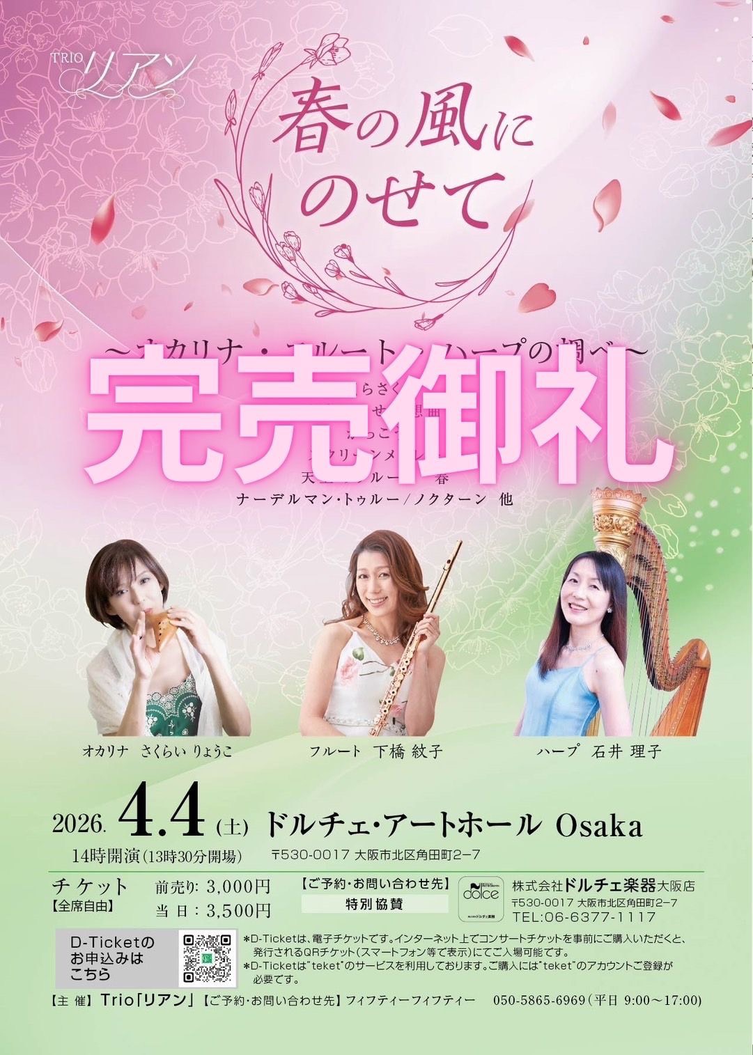 [事前に決済できる!電子チケット「LivePocket」での購入はこちら] *LivePocketは、電子チケットです。インターネット上でコンサートチケットを事前にご購入いただくと、 発行されるQRチケット(スマートフォン等で表示)にてご入場可能です。 *ご購入には”LivePocket”のアカウントご登録が必要です。 ドルチェ楽器大阪店 TEL 06-6377-1117 |