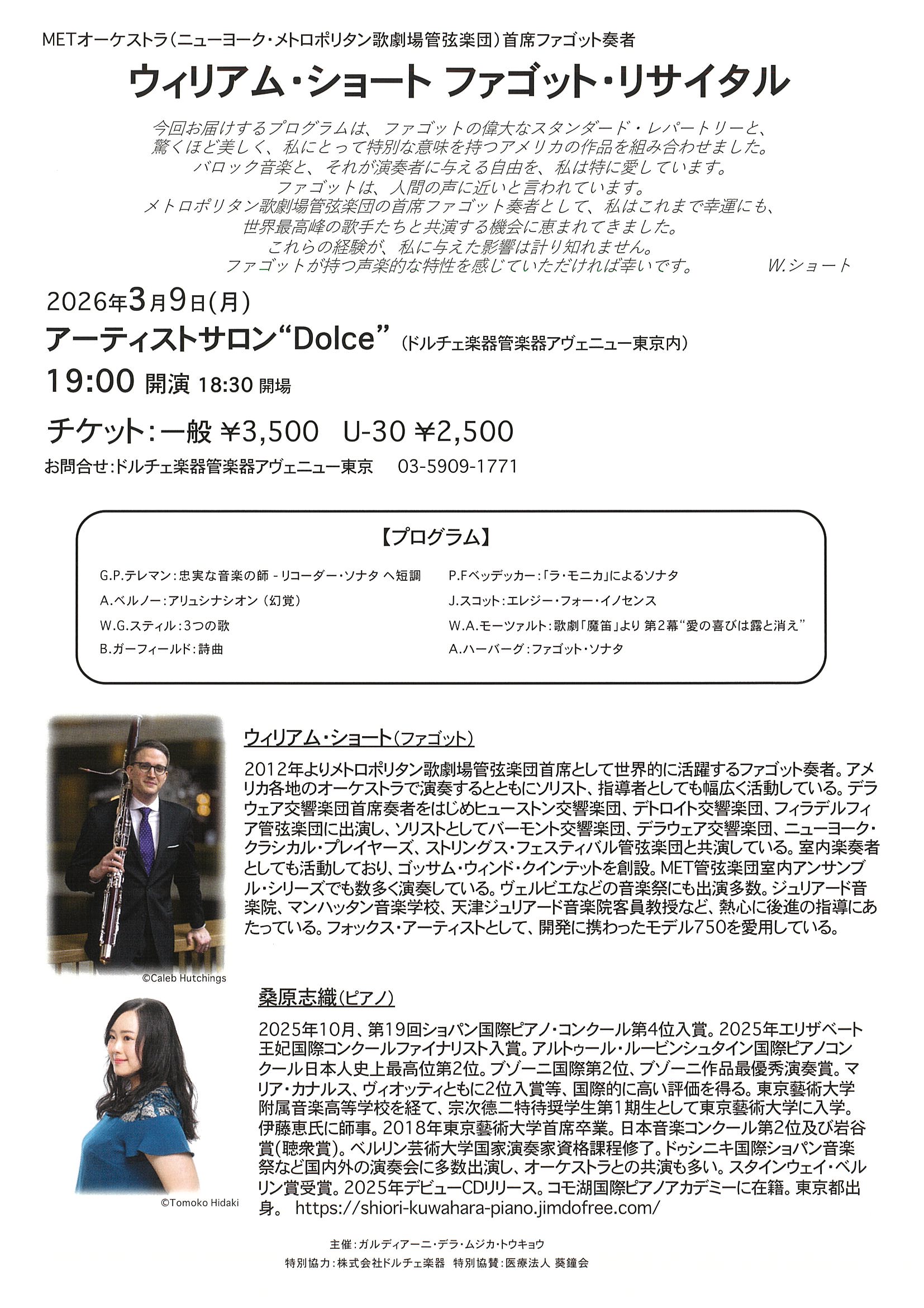 | 出演者 | ウィリアム・ショート(ファゴット) 桑原 志織(ピアノ) |