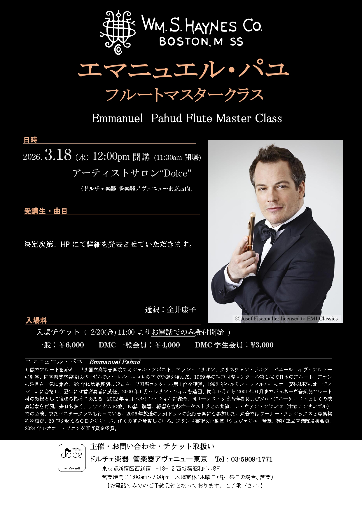 ドルチェ楽器東京店 フルートサロン Tel:03-5909-1771 E-mail:tokyo-flute@dolce.co.jp |