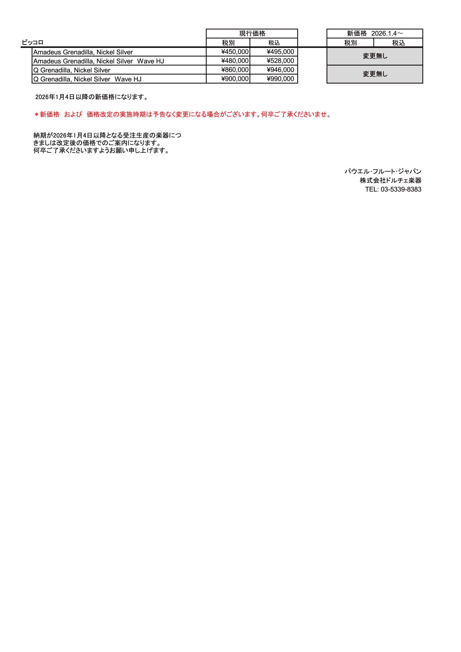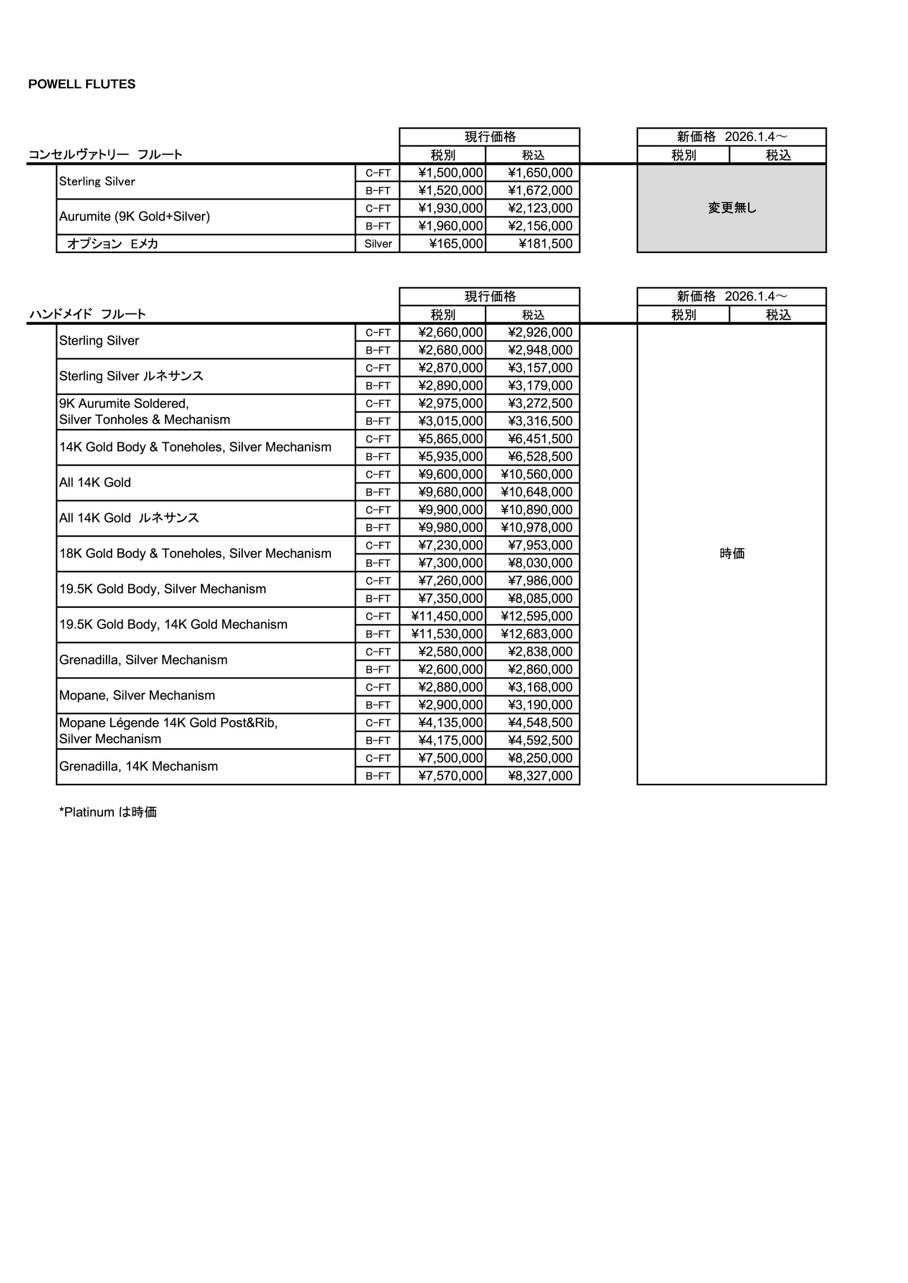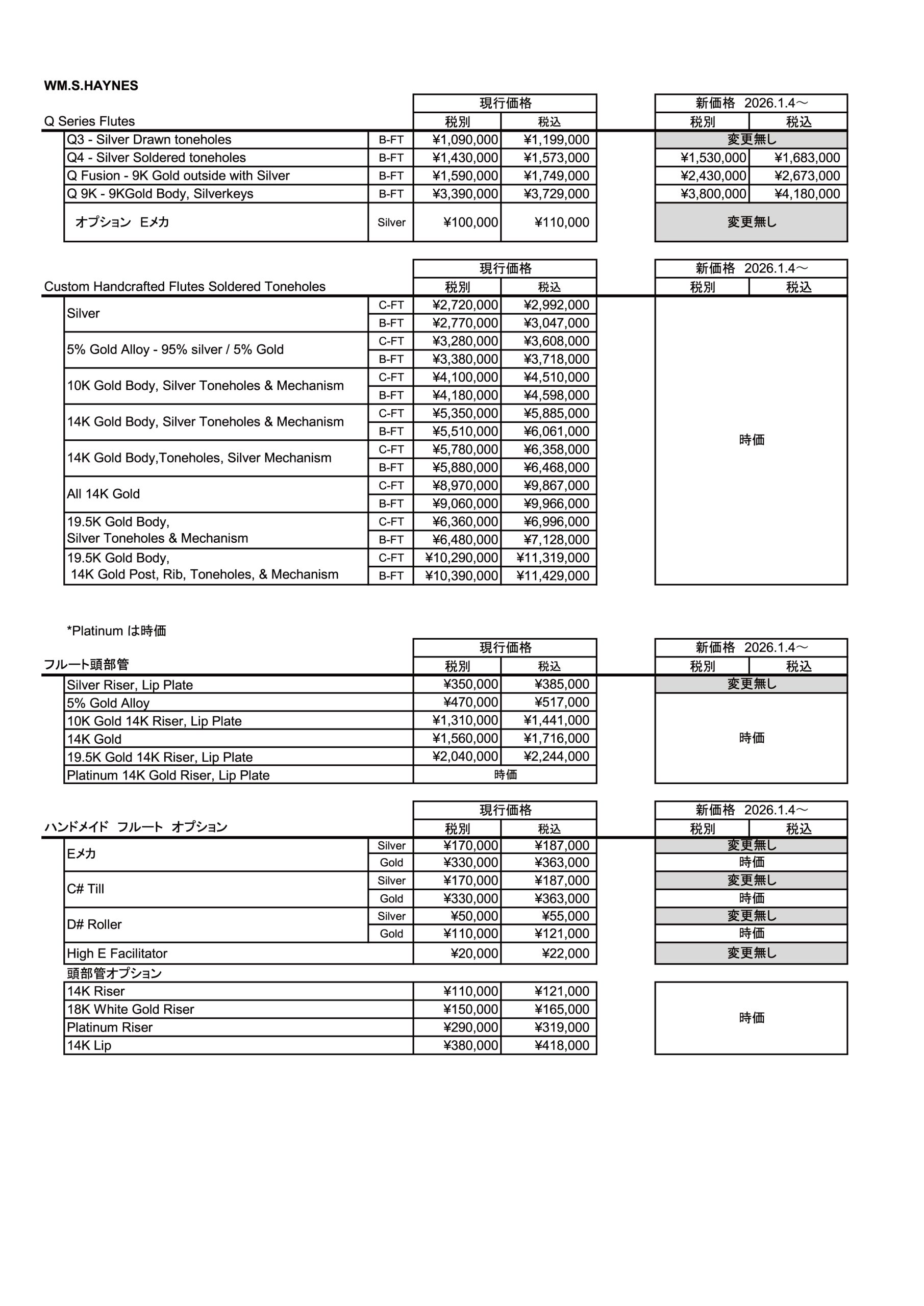 パウエルフルート、ヘインズフルート価格改定について