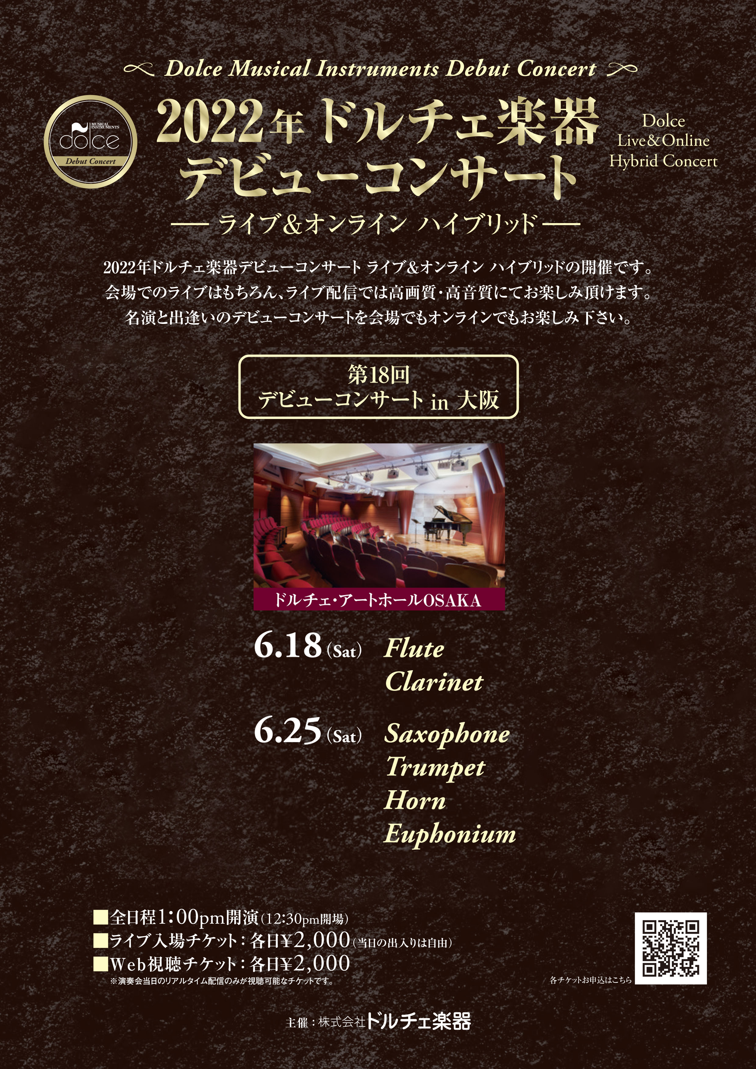 | 2022.06.25(土) | 午前 | 10:00am-9:00pm | 第18回ドルチェ楽器デビューコンサートin大阪6月25日Sax.Tp.Hr.Euph.Tuba |