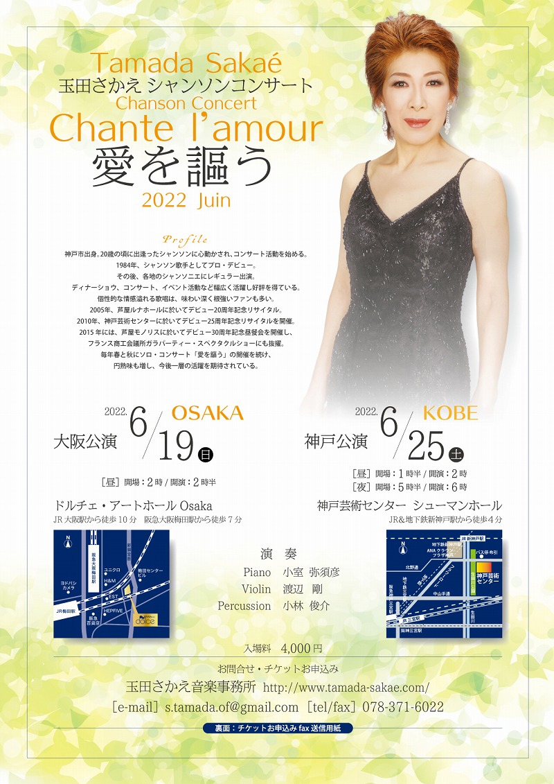 | 夜間 | 10:00am-6:00pm | 玉田さかえシャンソンコンサート「愛を謳う」6月19日14:30 | |